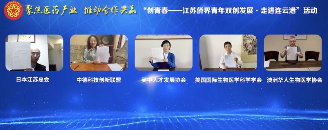 活动中,集团公司通过线上方式,与日本江苏总会、中德科技创新联盟、英中人才发展协会、美国国际生物医学学会、澳洲华人生物医学科学协会等海外侨社团签署了合作意向书;集团公司国际医药创新产业园与4家省内侨青企业现场签订合作协议。