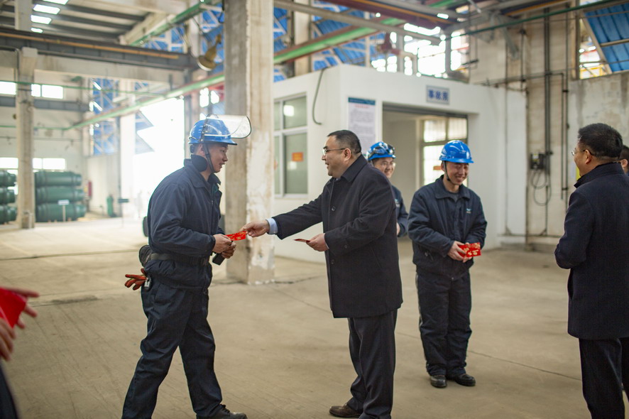 2月5日,集团公司董事长、党委书记杨龙,党委副书记戴鸿鸣等领导轻车简从,深入氯碱公司、氨纶公司、华茂公司、供电公司等基层单位,向春节期间坚守在生产一线的广大员工致以节日的问候和祝福,并送去慰问品。 (综合宣)