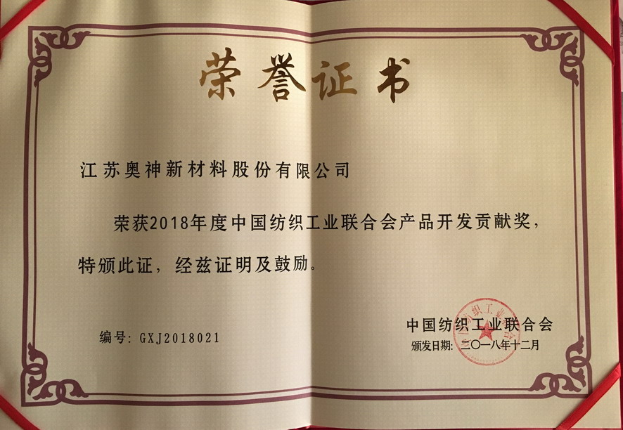 奥神新材料荣获2018年度中纺联产品开发贡献奖