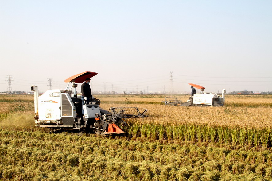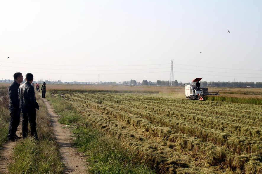 青口万亩连片水稻开镰收割