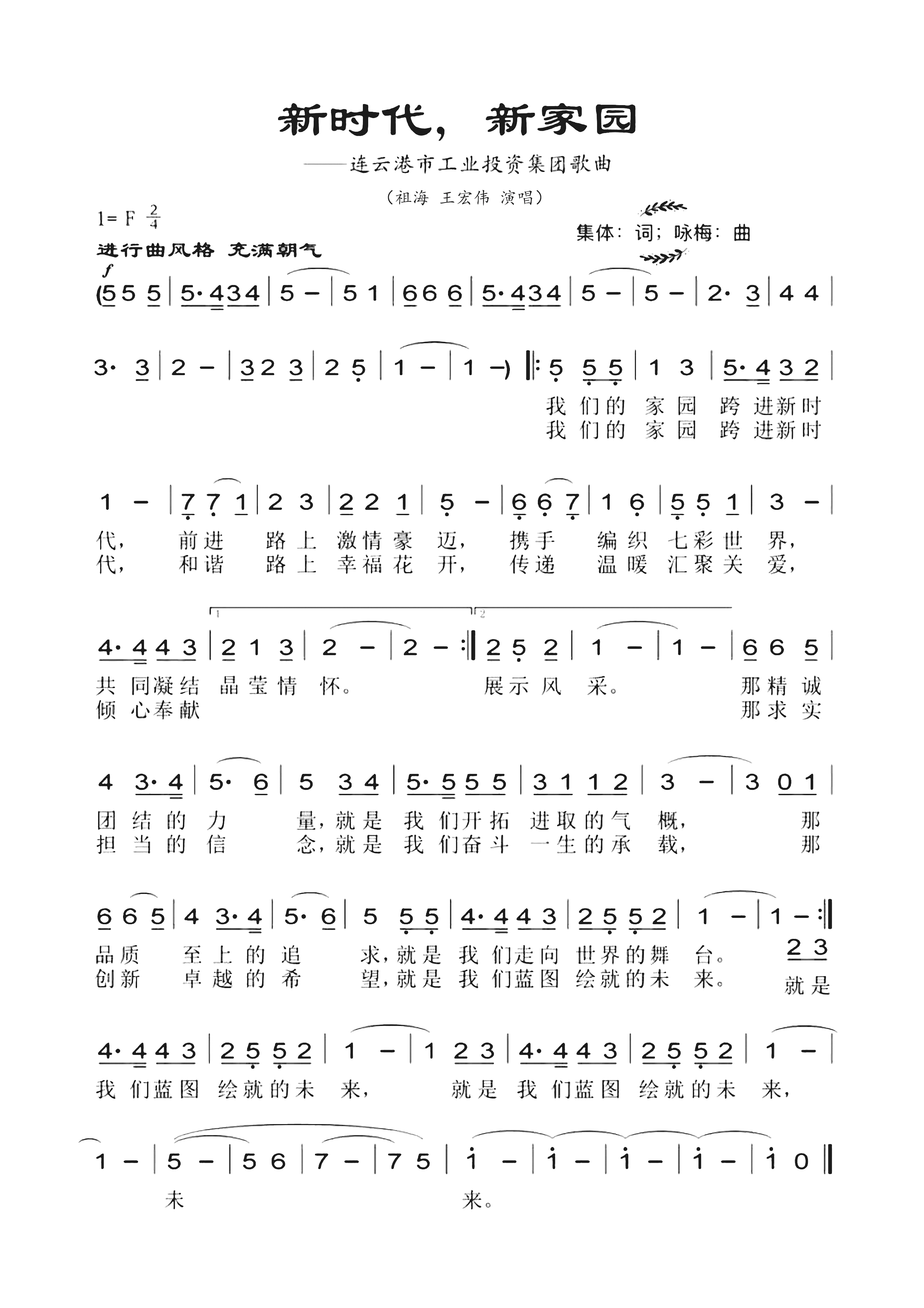 集团公司企业歌曲《新时代,新家园》由我国著名作曲家王咏梅作曲,我国著名歌唱家祖海、王宏伟演唱,亚洲爱乐乐团演奏,爱乐乐团艺术总监、首席指挥黄立杰指挥。