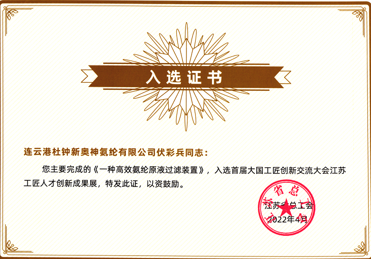 近日,全国总工会主办首届大国工匠创新交流大会,氨纶公司伏彩兵完成的《一种高效氨纶原液过滤装置》创新成果入选大国工匠展伏彩兵入选首届大国工匠创新交流大会江苏展区重点展示科创推荐通道。本次大会以技能强国,创新有我”为主题,通过线上线下形式展示以大国工匠为代表的广大职工的精湛技能和创新成果,为广大高技能人才搭建交流平台。