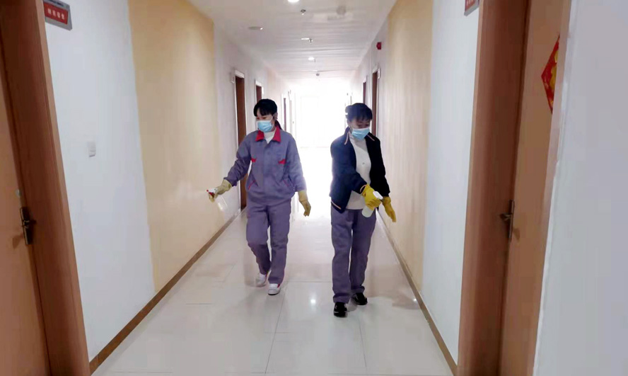 干净整洁的办公楼、宿舍楼里飘着淡淡的消毒水味道,清瘦干练的保洁员任礼勤正在仔细地打扫着楼道。5号疫情突发之时她正好当班,根据以往疫情经验,她果断地把一直照料着的年迈母亲安排给了大哥,此后便坚守在工作岗位上。疫情防控期间的工作量增加了不少,每天她和同事们分片作业,在认真做好各自清洁区每日两次的保洁、消毒工作的同时,还要负责就餐人员一日三餐的登记、测量体温等工作。每天从早上7点开始,5位保洁员的身影便忙碌在公司的门厅、餐厅、楼道、电梯等场所,这一忙常常要到晚上6点多。“请您量下体温”“今天你做核检了吗”,这些温馨的话语几乎成了她们对大家的问候语。