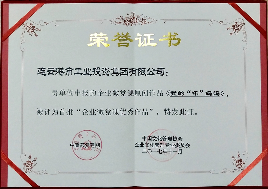 日前,在杭州举办的“2017中国文化管理协会企业文化管理年会暨企业文化学习实践分享会”上,集团公司拍摄的微电影《我的“坏妈妈”》被中共中央宣传部党建网等机构评为首批“企业微党课”优秀作品和第四届“最美企业之声”之《最美先锋之声》金奖代言作品。连云港市华茂绿化工程有限公司还被予“企业党建文化十强单位”荣誉称号。