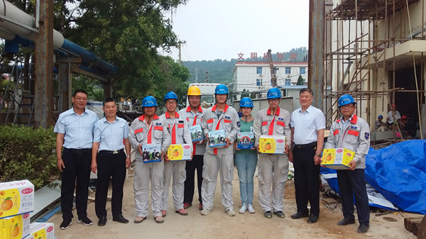 7月28日上午,公司党委书记吴再忠、经理孙政权、工会主席王志军一行深入氨纶施工现场走访慰问一线职工,送去深切的关怀和慰问,把防暑慰问品送到大家手中。在氨纶施工现场,孙经理同现场员工亲切交谈,叮嘱他们在保质保量完成工作任务的同时更要关心职工的身心健康。