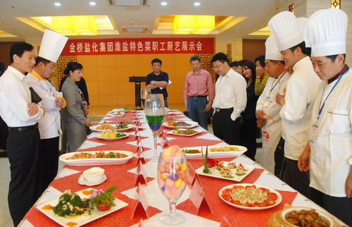 5月19日上午,金桥盐化集团淮盐特色菜职工厨艺展示会在淮盐大酒店隆重举办。公司党委副书记、纪委书记、工会主席卢明生致欢迎词,集团公司工会副主席李岚芹宣布比赛开始。来自集团公司各基层单位的13名技艺精湛的厨师做出了26道特色佳肴,经过评委会认真品评,台南盐场王树伟、青口盐场卢燕获一等奖,其他选手分获二、三等奖。(司宣)