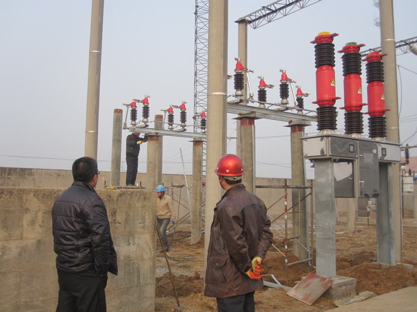 图为工人们在安装断路器