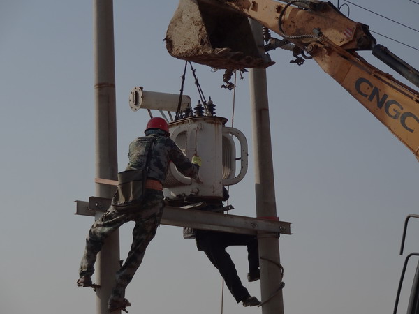 图为线路工正在安装变压器 4月25日,灌西供电所积极做好灌西盐场投资公司800亩改造好的农田灌溉用电服务。 灌西盐场投资公司800亩渔塘改造成农田工程已经完工,急需用电打淡水进行灌溉。该所为不影响农田灌溉,减化用电手续,迅速准备材料,组织人员以最快的速度立杆,并架设一台80KVA变压器,整个施工过程仅用半天时间,就安全供电,并优先保证供电。(王志勇)