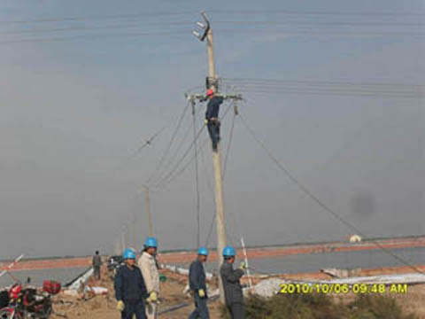 国庆期间,灌西供电所全体职工坚守岗位,工作在中国华能风力发电接电线路、集团公司矿卤二期工程作业施工现场。(图为工人正在架设线路)(杨守全)