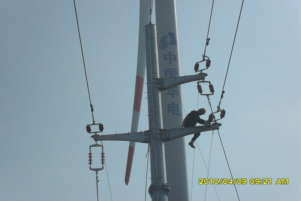 连日来,灌西供电所干部职工主动放弃节假日,起早贪黑参与风力发电线路安装架设工程,目前各项工作进展顺利。上图为工人正在进行高空杆作业。(王志勇)