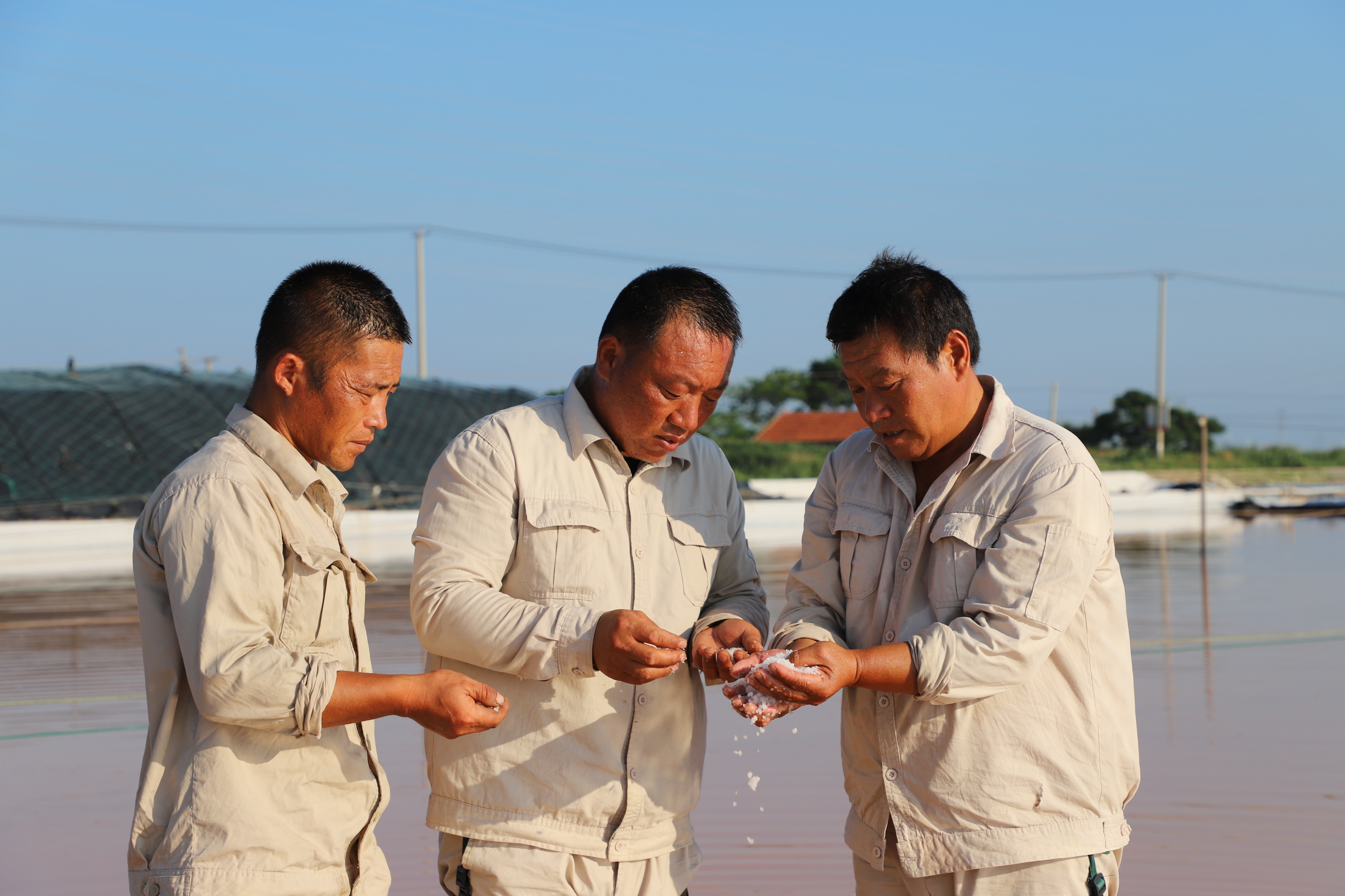 “气温越高,盐的蒸发量就越高,公司效益就好,按今年的产盐趋势,超额完成公司指标任务应该不成问题,我们工人心里也高兴呀!”劳模祝星星擦着脸上的汗珠自豪的说道。“晴天一身汗,雨天一身泥”是制盐人的家常便饭,为确保汛期安全生产,避开高温时段作业,凌晨五点钟,工人们已忙着卤水除硫、维护收拉塑布收房系统、修补塑布……。盐工身上的汗水与卤水交织在一起,浸湿了工作服,透过骄阳他们黝黑的脸庞显得越发的锃亮。