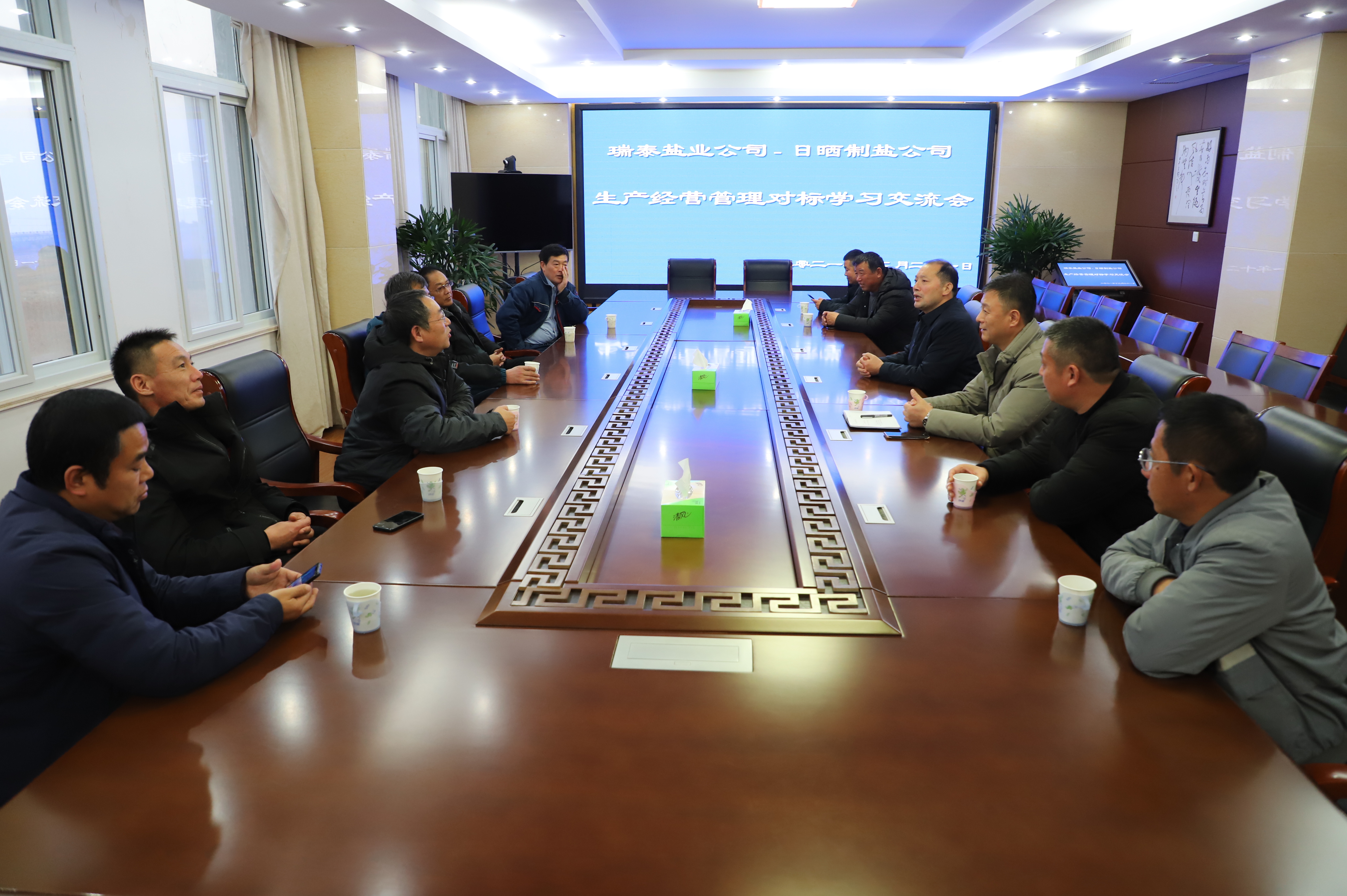 1221日,瑞泰盐业公司对标学习交流团来日晒制盐公司开展交流学习活动。灌西投资公司党委书记、董事长、总经理李国文、常务副总经理吴卫平及日晒制盐公司相关单位部门负责人出席学习交流会。