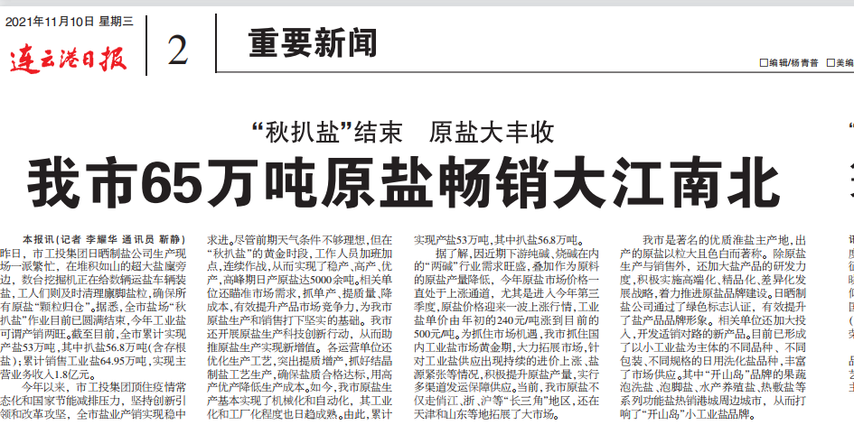 连云港日报刊登:我市65万吨原盐畅销大江南北