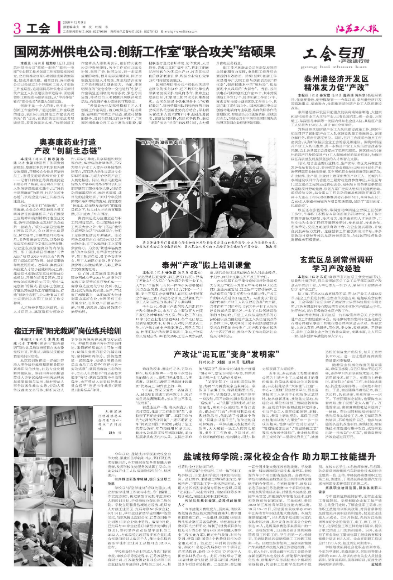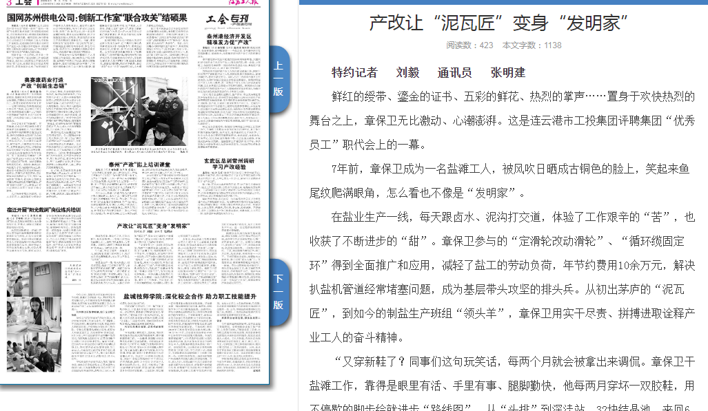 12月9日,《江苏工人报》第三版刊登灌西公司产改故事:产改让“泥瓦匠”变身“发明家”