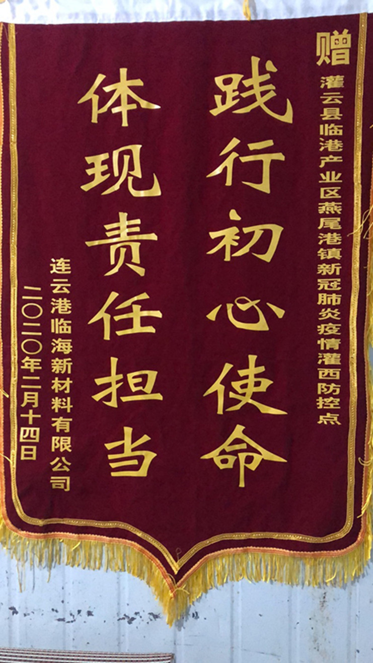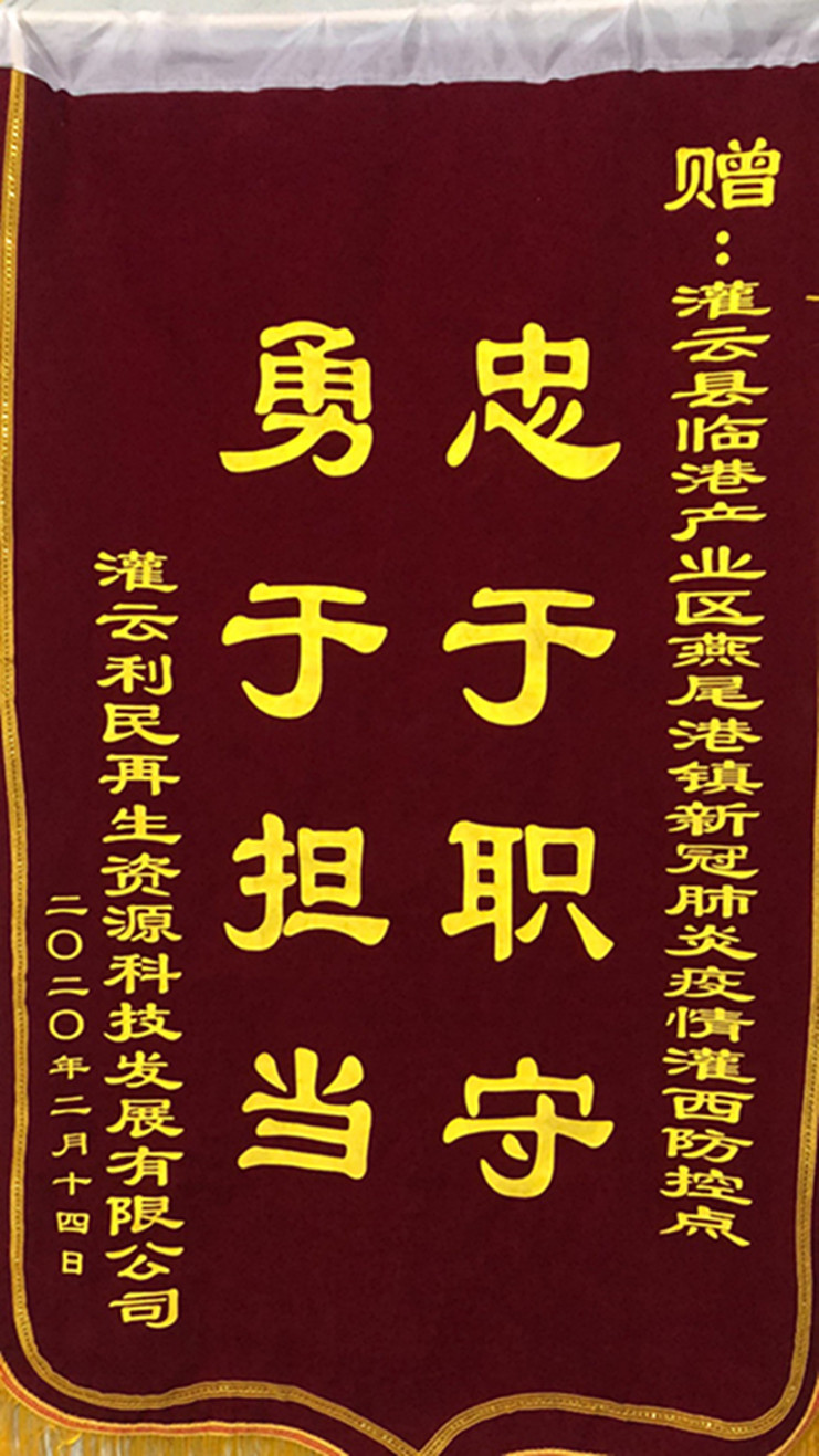 “非常感谢你们对我们三家公司的守护,为我们广大职工筑牢了一道防疫情的铜墙铁壁,你们辛苦了!”近日,连云港临海新材、灌云利民再生资源、江苏沙英喜三家公司分别为新冠肺炎疫情灌西防控点值守人员送来三面锦旗,感谢灌西投资公司值守人员在疫情期间为疫情防控工作作出的贡献。