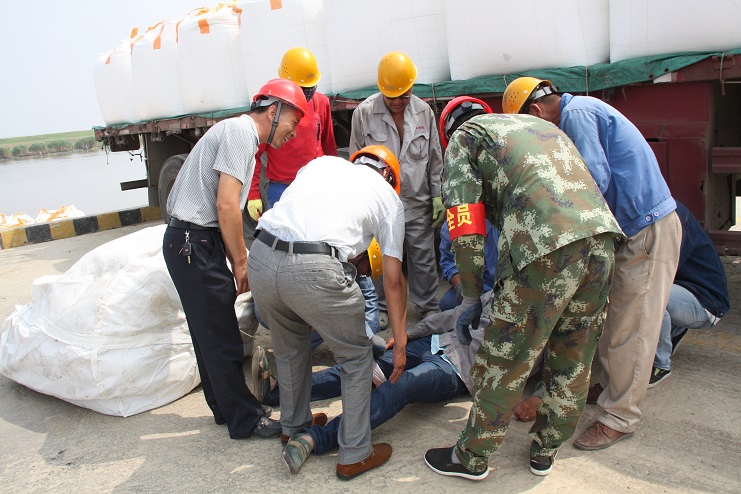 在这次的安全演练中,投资公司运营监管部部长李长军主持了这次的安全演练活动,宵洋物流公司码头当班作业人员参与演练。在五灌河码头,正在吊装的吨袋脱落,砸在一名操作人员的腿上,安全员王绪银立即指挥停止作业,作业现场安全负责人陆应兵立即现场指挥人员现场施救,查看伤情,拨打120急救电话,同时向单位负责人沈志兵汇报。沈志兵及时赶到现场启动应急预案,疏散场地车辆,让出120进场通道,命令救援小组展开紧急救援,并向公司运营监管部和领导报告。在救援中,大家各司其职,齐心协力,配合默契,有条不紊成功完成了此次演练活动。通过这次应急演练;进一步提高了公司员工在发生安全伤害事故时的现场处置能力和自救能力。