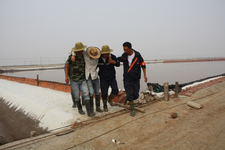 在这次的安全演练活动中,投资公司运营监管部部长李长军主持了这次的安全演练活动,新河制盐分公司九班全体员工参与演练。演练模拟现场,气温高达32.度,天气闷热,让人透不过气,滩上几名工人正在头排格劳动,有的在整理塑料绳,有的在整理防风布,其中一名蹲在格堰旁边整理防风布的男工,在直起身来擦汗时,突然晕倒,瘫坐在格堰旁,旁边的工人连忙停下手中工作,将病员扶平躺下,同时喊班长来。在班长的指挥下,几人一齐将病人扶到值班室前通风处,一边为病人降温、喂藿香正气水和淡盐水进行救护,一边逐级向公司安全负责人汇报情况。公司领导来到现场了解情况,查看病情,拨打急救电话组织施救,并向公司运营监管部和领导报告。在救援过程中,大家各司其职,齐心协力,配合默契,有条不紊成功完成了此次演练活动。通过这次应急演练,进一步提高了公司员工应对紧急事件的自我保护和防卫能力,保证员工在发生突发事件时,能熟练应对、有序救援,最大限度地减少事故带来的损害,切实保护员工的安全。