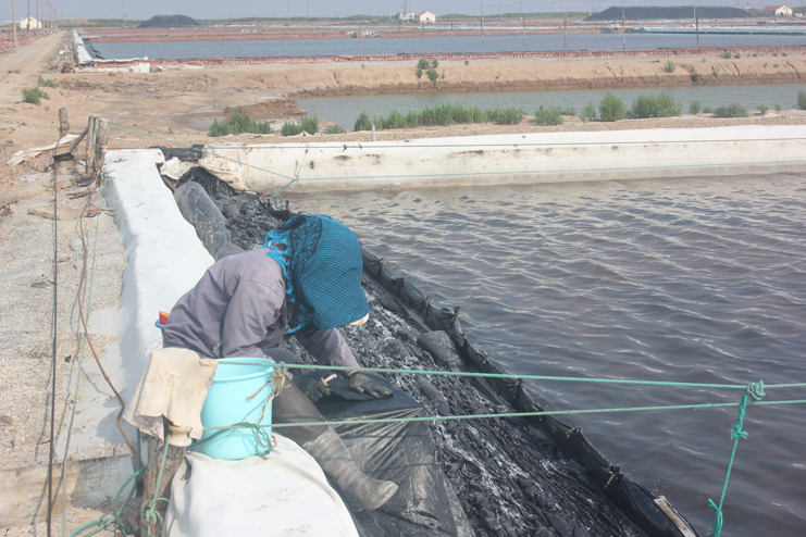 我们首先来到新河制盐分公司十二班,映入我眼帘的是一位女工头顶烈日坐在滩头认真修补塑料布,她用毛巾将破损地方擦拭干净,待水渍干透,涂抹上胶水,再将一块新的布粘贴上去,技艺十分娴熟。