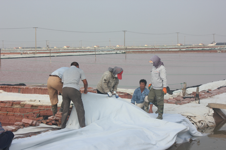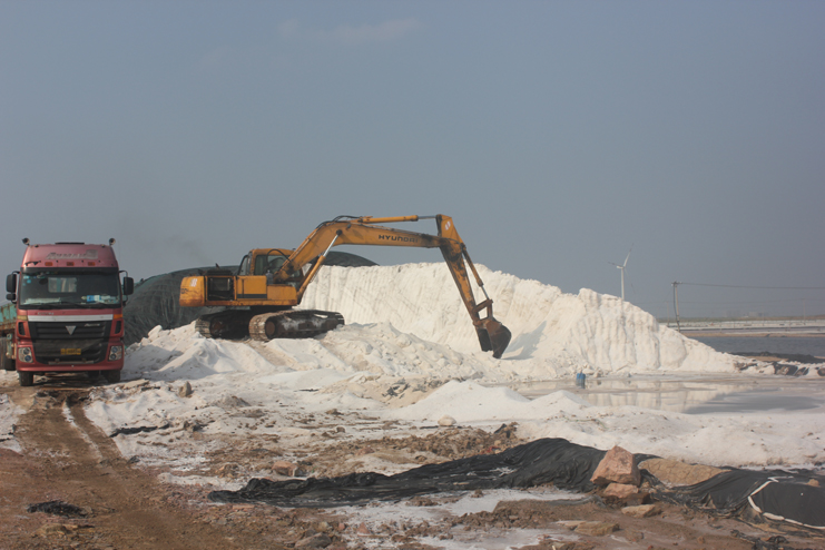 随后我们又来到了新河制盐分公司十四班的装盐现场。一位工人操作着挖掘机,往卡车上装盐销售,如今装盐实现了机械化,工人的劳动负荷也减轻了许多。在埒南制盐分公司的五班,我们看到七八个工人正在滩头更换土工布,他们一字排开,先将土工布铺开,然后分工合作,有的人负责把布理齐铺平,有的则把砖头铺放在布上用来固化。