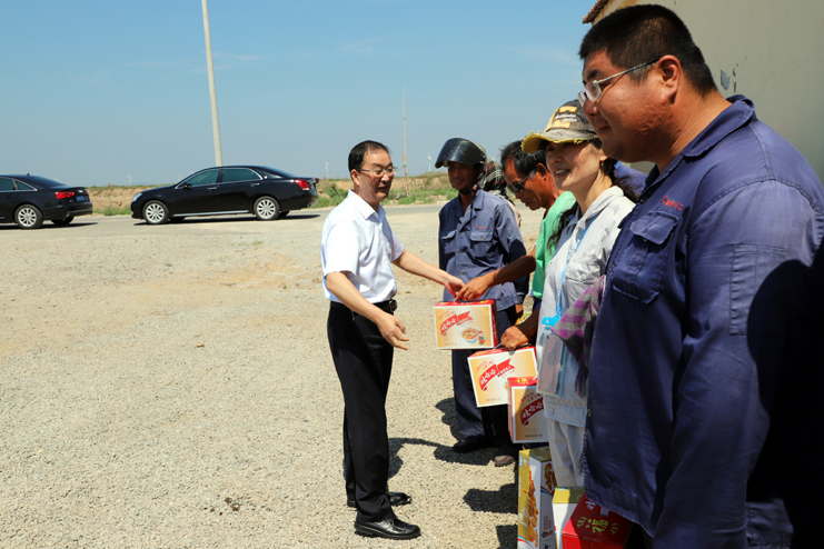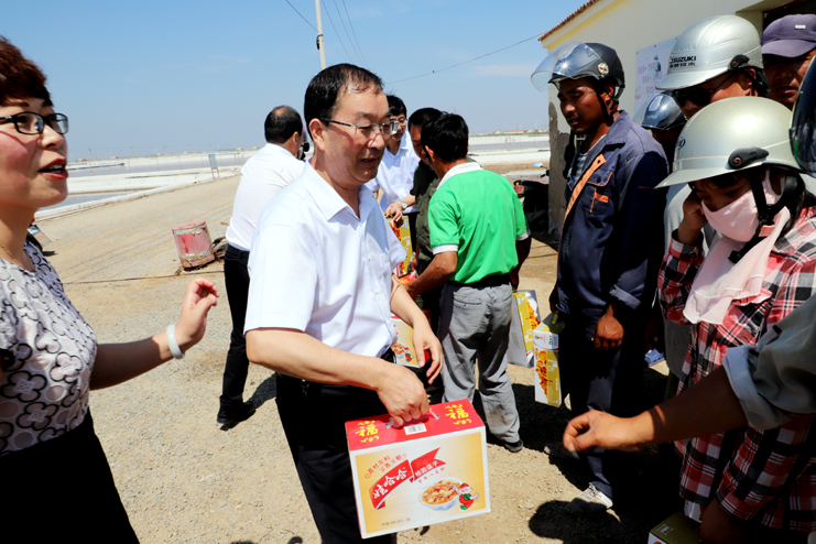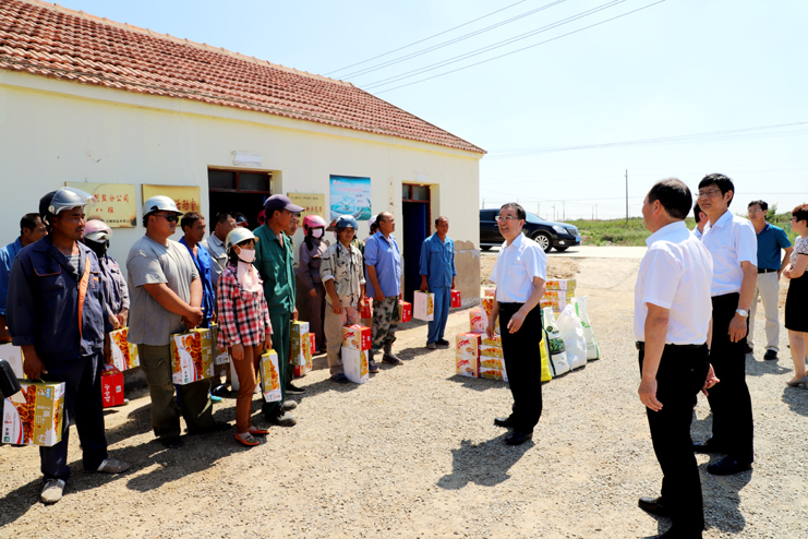 入伏以来,持续高温,为确保一线生产单位工作顺利开展,保证员工身体健康。7月18日上午,集团公司总经理胡建明、副总经理张其海一行深入日晒制盐公司走访慰问一线职工,把绿豆、饮料等慰问品送到他们手中,在炎炎夏季,为一线职工送去集团公司领导的深切关怀与阵阵清凉。