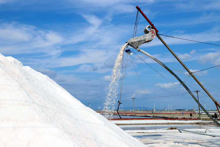 在10班扒盐现场,我们看到扒盐机“T30”操作手正在娴熟的驾驶着机器在盐池内缓缓移动,远处的盐廪上,雪白的原盐正通过扒盐筛汇集而下,大廪工也不时的用分离板进行引盐疏导,洁白晶莹的盐晶蔚然成廪。据介绍,在扒盐设备上,今年日晒制盐公司全面推广使用五寸管道、轻型自吸式电动履带“T30”扒盐机、扒盐机盐池循环路径,轻型扒盐机降低了对盐池板的损伤,在扒盐效率上也有了很大提高,扒盐机盐池循环路径也进一步降低了工人的劳动负荷。据了解,目前新河、埒南两个制盐分公司共投入8台扒盐机组,中秋小长假以扒盐2万多吨,预计11月上旬结束。(张明建)