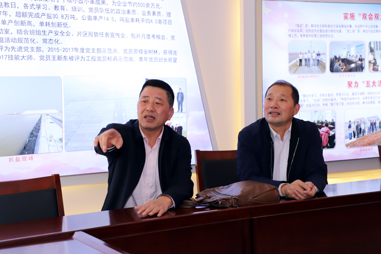 检查组一行先后到新河制盐分公司、老机关新建党建室进行实地检查验收,在新河制盐分公司党建活动室,江舜军部长一行详细听取了该党支部书记李加新对党建工作的汇报,随后,在老机关综合党员活动中心,检查组一行利用活动室电子显示屏观看了集团司歌视频。