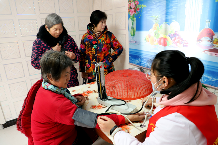 九点半,志愿者们来到中二圩社区新建点邱长松家,邱老跟老伴正在拣黄豆芽,准备中午的饭菜。看到志愿者们的到来,两位老人热情地迎出门来,招呼我们进屋,我们来到房间里,映入眼帘的是一张老式的八仙桌摆在室内的一角,整个房间里摆设很简单,可以看出来老人的艰苦朴素、勤俭节约的生活作风。志愿者和老两口拉起家常,询问身体状况和生活困难,并帮着大爷大妈拣黄豆芽。“我身体没有什么大毛病,就是年岁大了,行动不方便,小孩都不在身边,要感谢志愿者来看我们老两口”,邱大爷诚恳的话语表达着心里的感谢。医疗志愿者为邱大爷跟老伴做了身体的简单检查,这时从外面走来几位刚买完菜路过的大婶、大妈们,她们听说有医疗志愿者在邱大爷家,也纷纷过来让志愿者医疗队的医生查查身体,“我家就住在隔壁,听说有志愿者医疗队来,我就想过来让医生帮我量量血压,最近血压或高或低的”,“刚在街上买菜回来,路过这,看都穿灌西志愿者红马甲,我就进来看看的,正好医疗队在,我也给医生查查看看。”大婶、大妈们热情的表达。