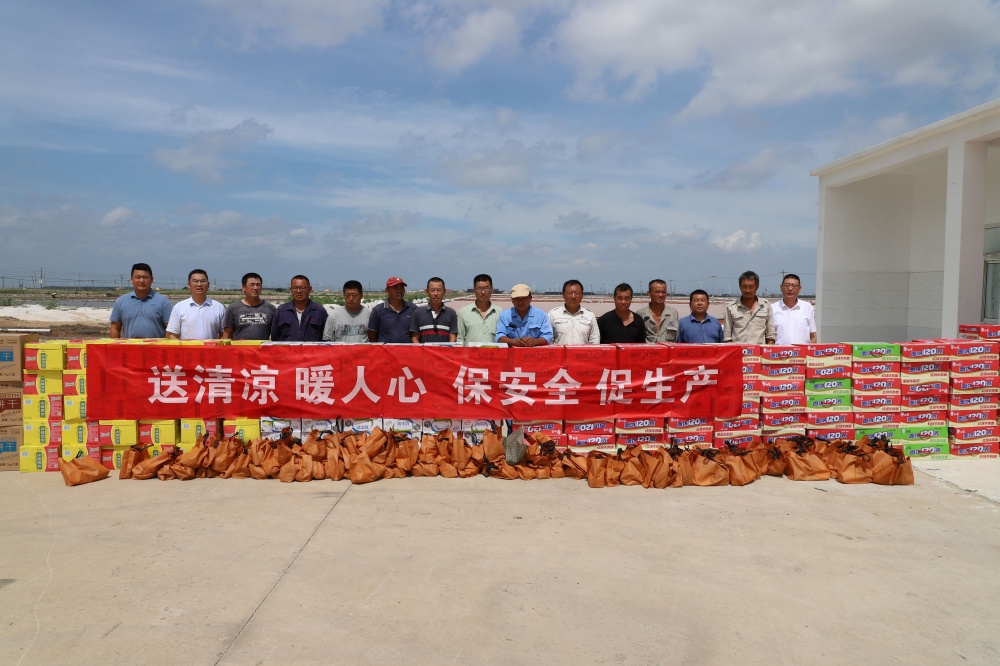 7月中旬的盐场滩头,烈日是毫无情面的主宰,把盐田晒得泛出刺目的白光,那光里藏着盐分的结晶,也藏着蒸腾的暑气。公司党委书记、董事长孙政权带领慰问组来到这里时,盐工们正在这片光与热中专注地除硫、修复抗灾设施。“师傅们辛苦了!这么热的天可得注意防暑!”孙政权快步走上前,将装有绿豆、白糖的“清凉礼包”递到职工手中,手掌触碰到他们被汗水浸湿的工装,他不禁加重了语气叮嘱道:“一定要合理安排作息时间,千万别硬扛着,只有保持身体健康,才能以充沛的体力和饱满的热情投入到安全生产等各项工作中去。”