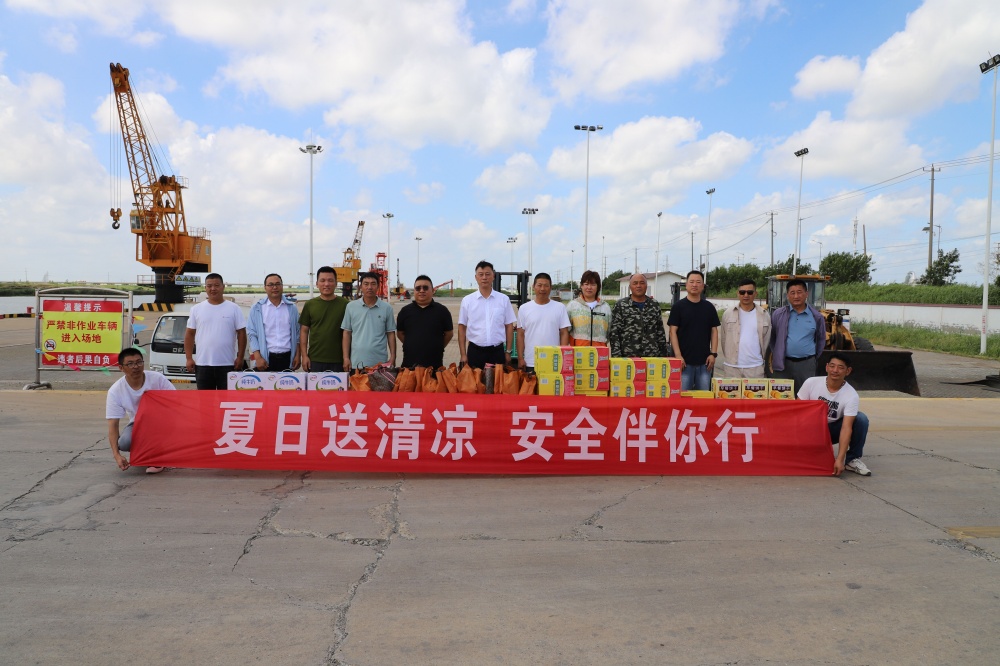 在宵洋物流码头,公司总经理吴卫平带领的慰问组特意带来了“清凉礼包”。在观看塔吊安装现场作业的过程中,他眉头微蹙,仔细观察着每一个环节。随后,他严肃地要求道:“要进一步加强现场的安全管理,把防暑降温措施切实落到实处,不能有丝毫松懈,务必确保一线职工能度过一个安全、清凉的夏季。”吊装梁师傅接过物资时,安全帽下的脸颊挂满汗珠,却笑得格外灿烂:“工会想得比家里人还周到!”