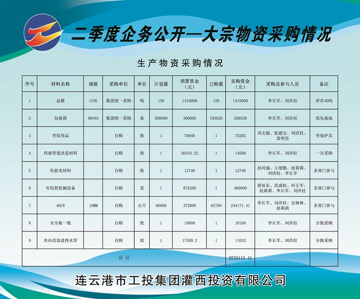 1、由集团公司集中采购塑料布(盐膜)150吨(由工投集团运营监管部在总部组织招标)、包装袋20万条,实购金额计169.953万元。