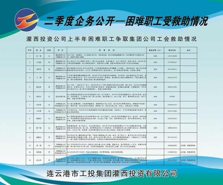 1、人员变动情况:庄忠明同志任埒南制盐分公司党支部副书记,免去埒南制盐分公司副经理职务;葛高平同志任连云港宵洋物流公司党支部书记兼工会主席;唐建军同志任江苏省西旺水产实业有限公司副总经理;于同刚同志任连云港市灌西实业公司制盐分公司经理;唐广付同志任新河制盐分公司副经理,免去柴门制盐分公司工会主席职务;王忠良同志任生产服务公司安全员。