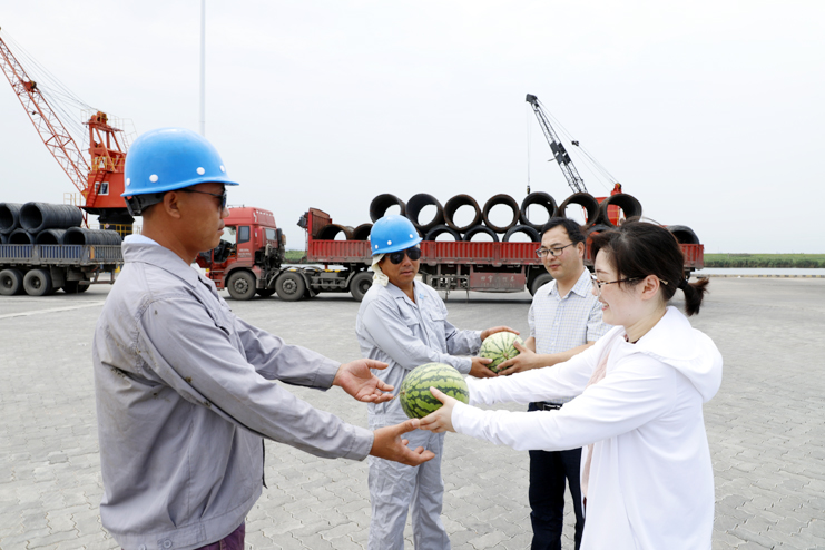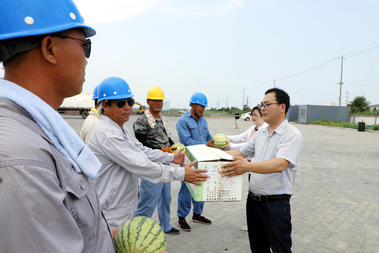 入伏以来,气温持续攀升,五灌河码头装卸工作也迎来了夏季高温的“烤验”。为做好高温酷暑期间的防暑降温工作,确保职工工作安全和身心健康,7月25日,灌西工会一行到宵洋五灌河码头为坚守在岗位上奋战的码头工人送去关怀和问候。 高温笼罩下的码头暑气蒸腾,灌西工会为码头工人送来了西瓜、白糖、绿豆、药品等防暑降温物品。并叮嘱职工们要注意安全生产,做好防暑降温工作。(张明建)