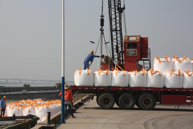 4月30日上午9时许,随着一声汽车长笛,一辆载有近40吨化工物资的卡车徐徐停靠在宵洋物流公司五灌河码头边,紧接着码头铁臂起舞,机械操作工娴熟地操纵着塔吊机械,准确地将一包包吨贷物资装卸在码头边的货船中。。。。。。自此,一辆辆满载40余吨货物的卡车源源不断向码头驶来。