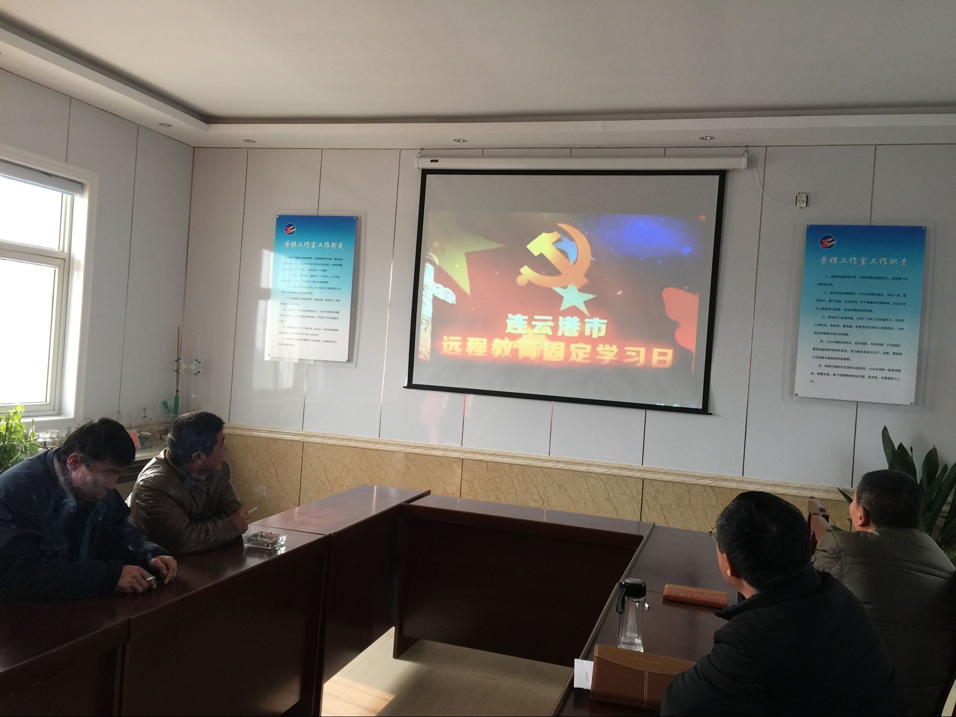 1月18日,新河制盐分公司党员、入党积极分子在劳模创新工作室观看爱国主义电影《空天猎》。