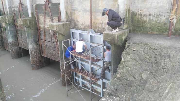 为确保机电设备运行正常,按时供好水,服务好海水养殖业。连日来,机电服务公司认真组织好修理人员,对六圩闸站机电设备进行修理维护。在市劳模、机修组长王绪华的带领下,所有参加人员不怕脏和累,赶潮水,对水泵、闸门、启闭机等进行维修作业。该组有6名修理人员,其中有3名是党员,1名党积子,他们能身先士卒,发挥了党员先锋作用,二星级员工程洪连能吃苦在前,脏了3套工作服,都没有心疼。经过近2周时间维护修理,共修理155KW水泵2台、启闭机1台,拆除木闸门、安装钢闸门各1块、更新草挡2片。为正常开机扬水提供了保障。(机电服务公司)
