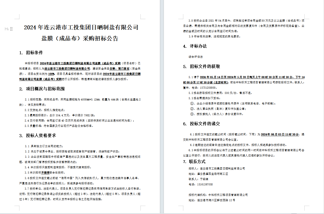 2024年连云港市工投集团日晒制盐有限公司盐膜(成品布)采购招标公告