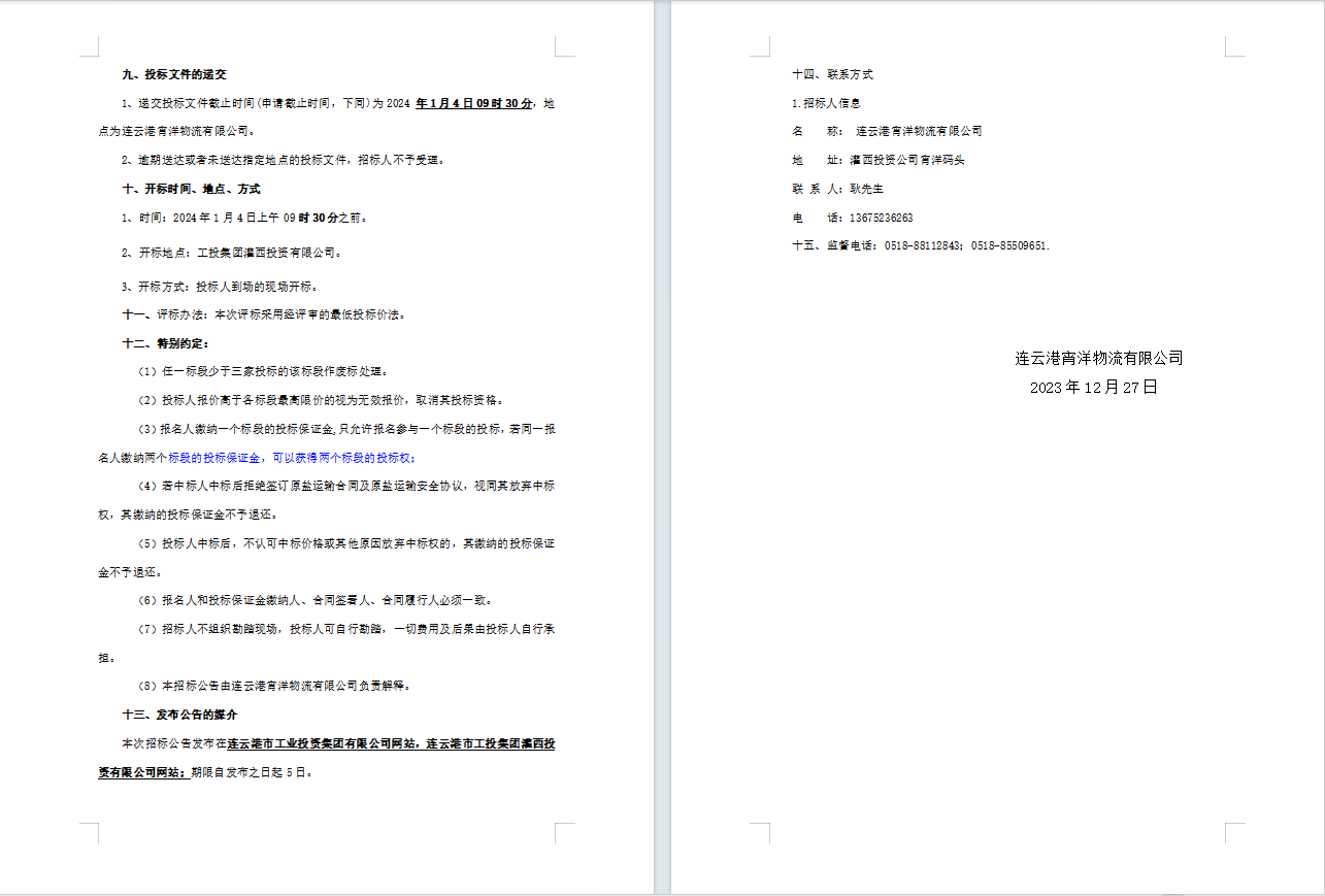 连云港宵洋物流有限公司原盐车辆运输服务业务招标公告(二次)