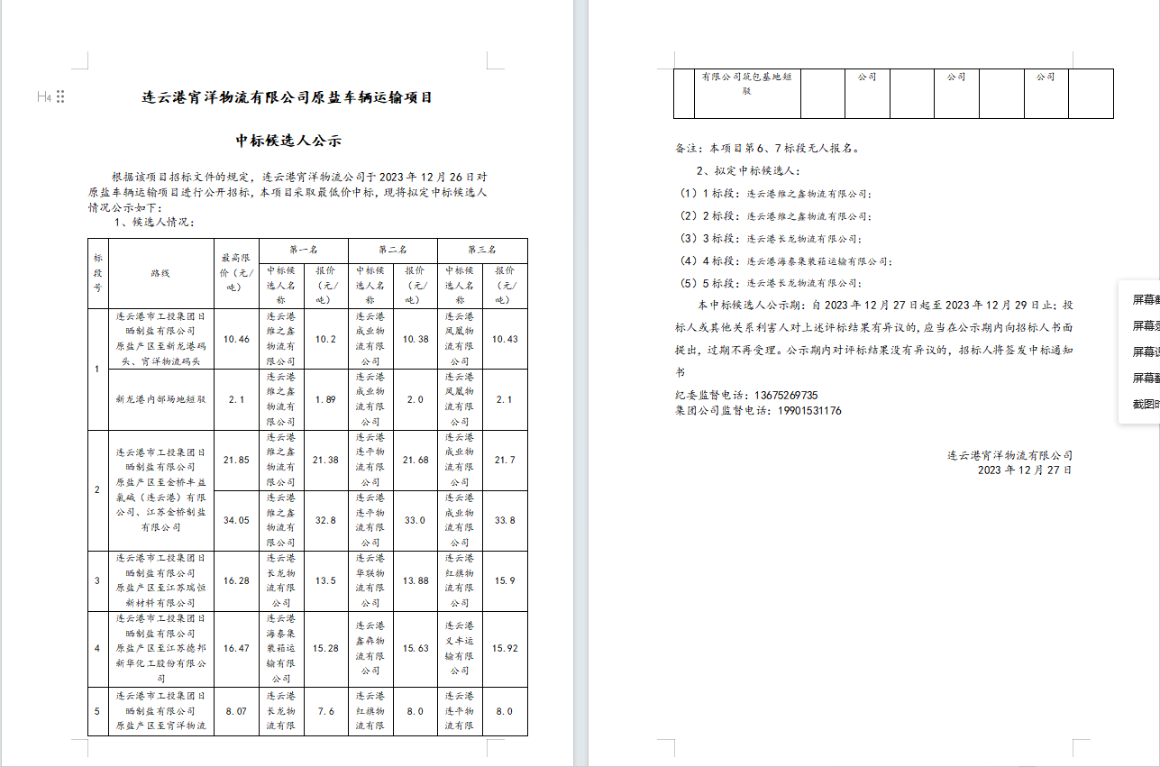 连云港宵洋物流有限公司原盐车辆运输项目中标候选人公示