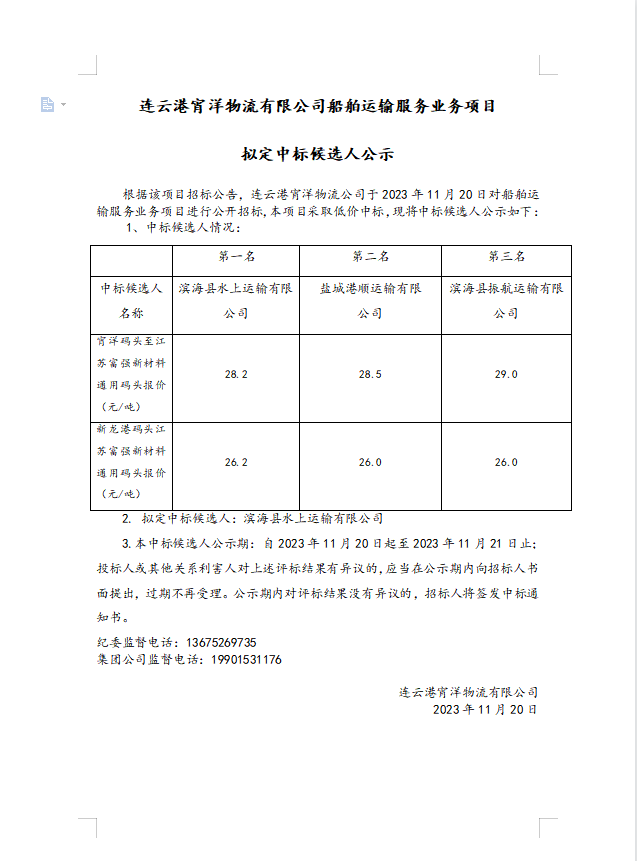连云港宵洋物流有限公司船舶运输服务业务项目拟定中标候选人公示