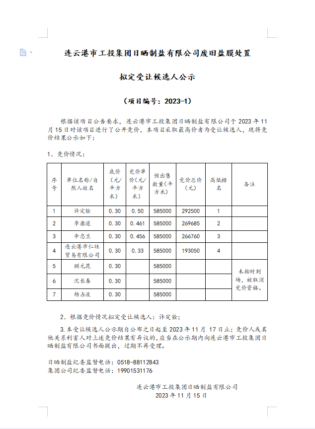 连云港市工投集团日晒制盐有限公司废旧盐膜处置拟定受让候选人公示