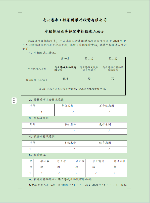 连云港市工投集团灌西投资有限公司水稻转运业务拟定中标候选人公示