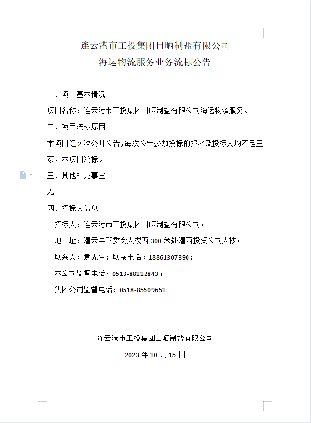 连云港市工投集团日晒制盐有限公司海运物流服务业务流标公告
