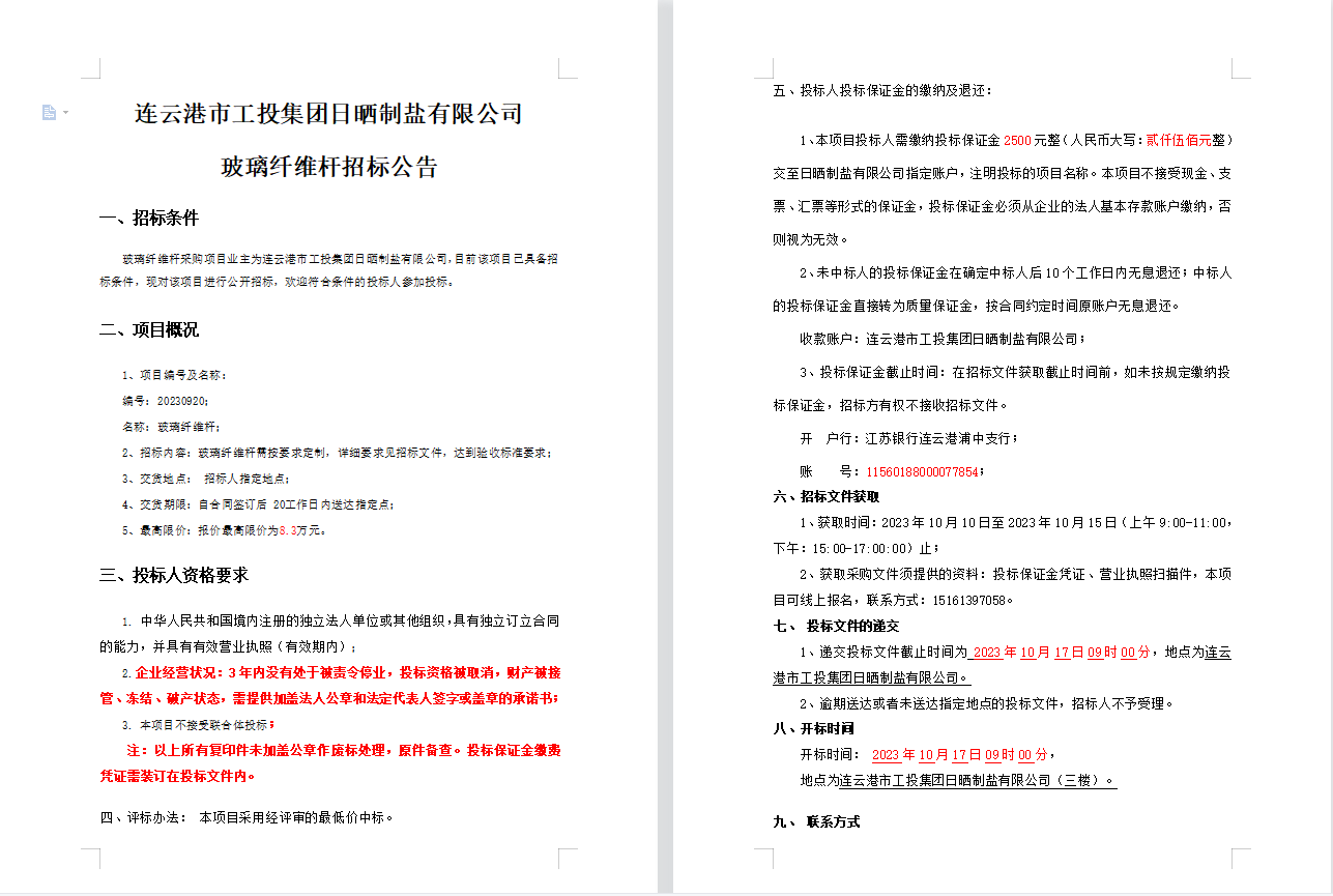 连云港市工投集团日晒制盐有限公司 玻璃纤维杆招标公告