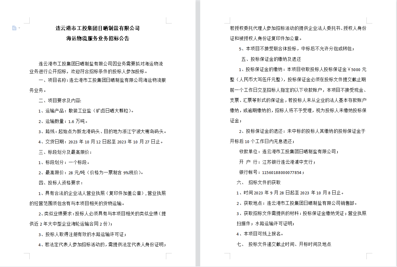 连云港市工投集团日晒制盐有限公司海运物流服务业务招标公告
