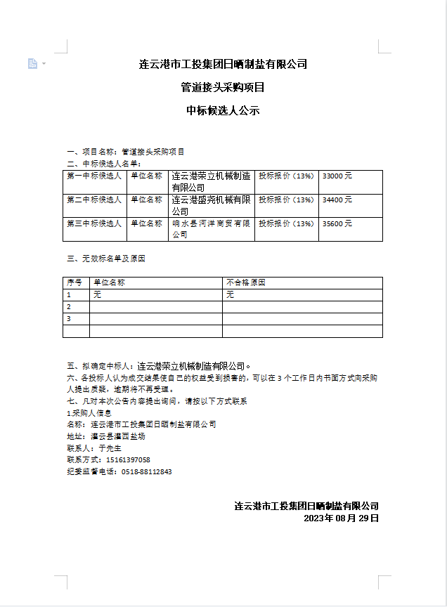 连云港市工投集团日晒制盐有限公司 管道接头采购项目中标候选人公示