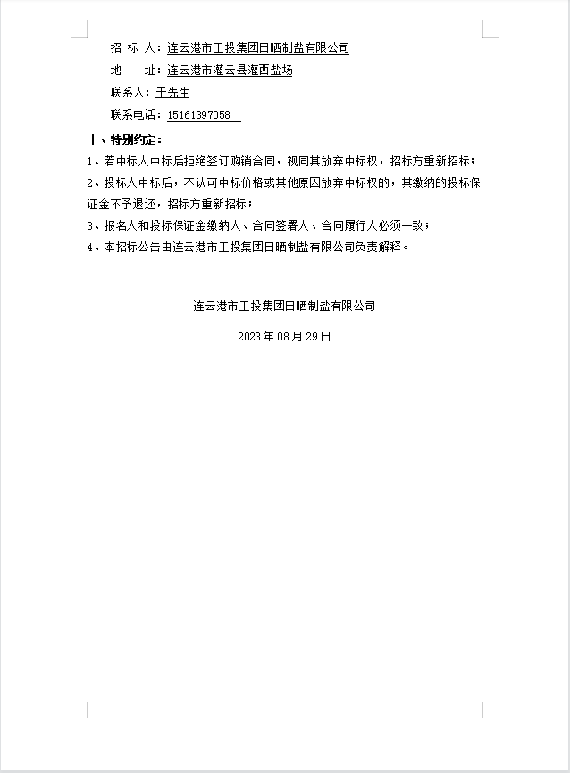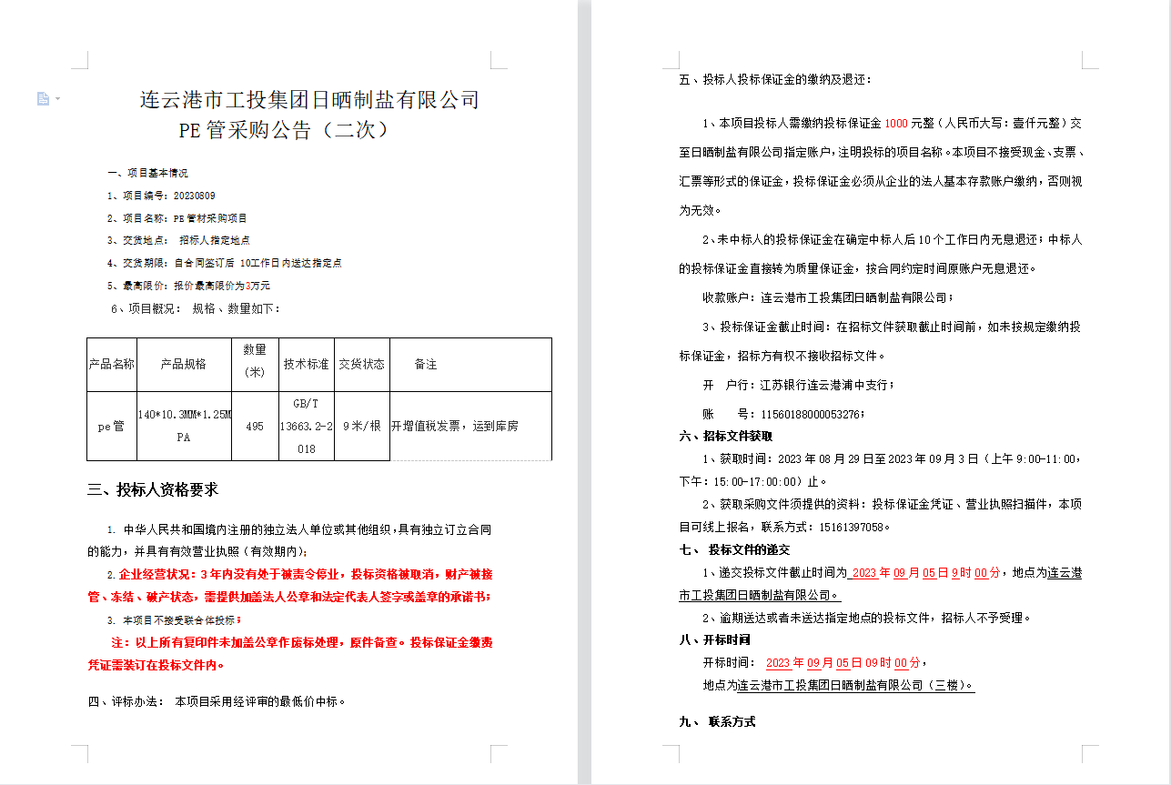 连云港市工投集团日晒制盐有限公司PE管采购公告(二次)