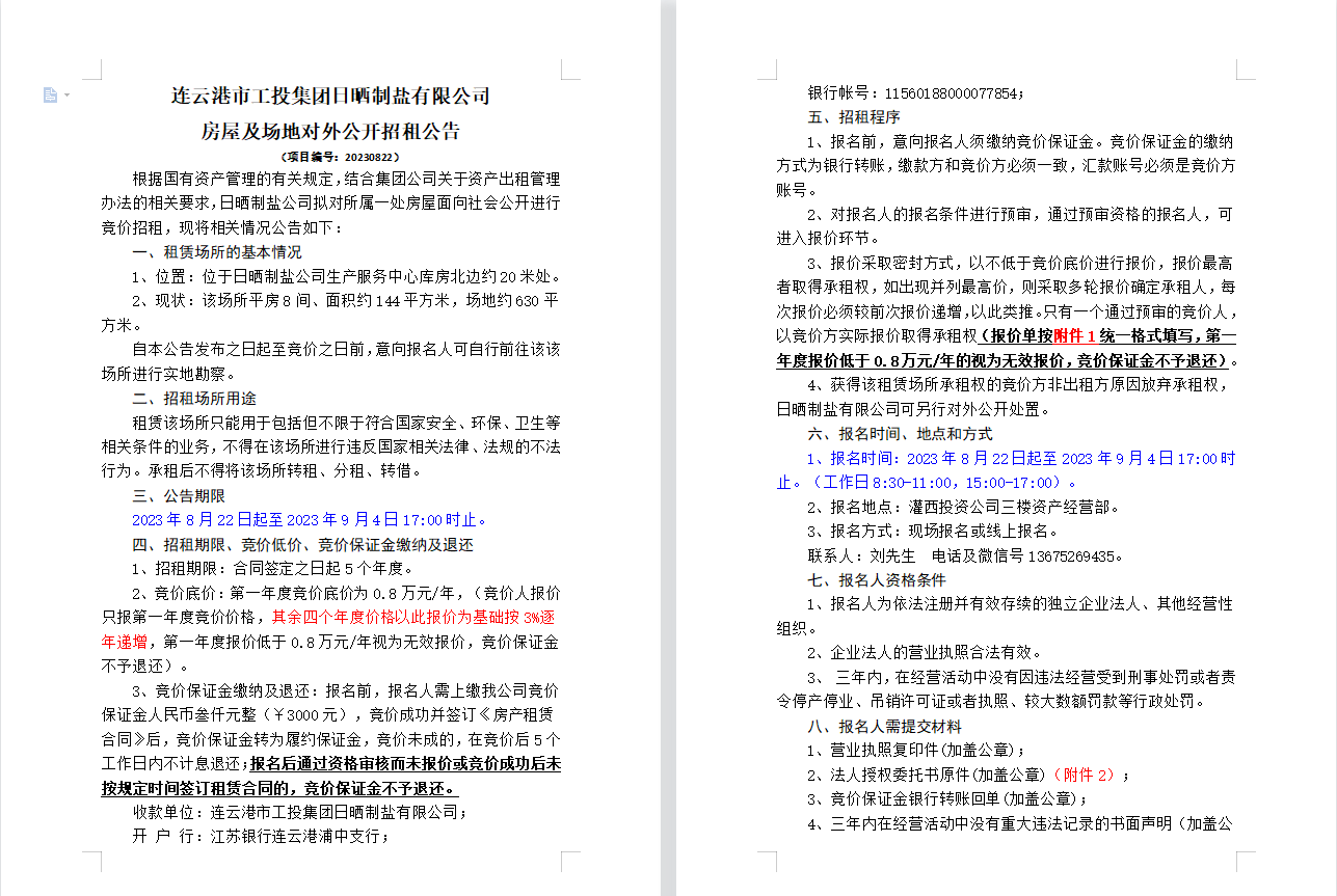 连云港市工投集团日晒制盐有限公司 房屋及场地对外公开招租公告