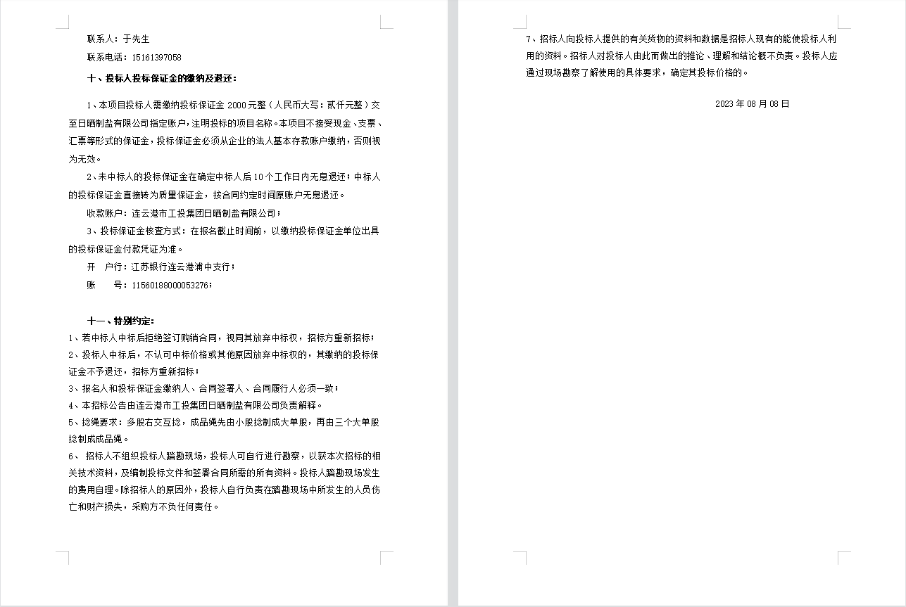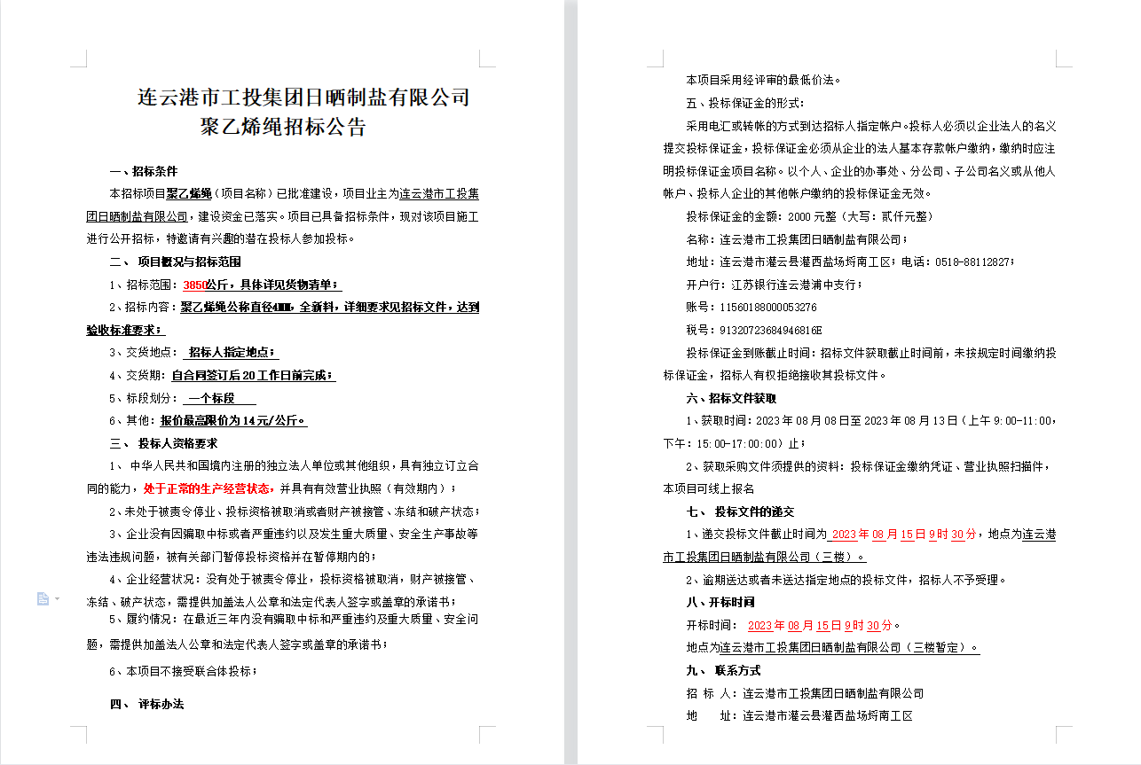 连云港市工投集团日晒制盐有限公司聚乙烯绳招标公告