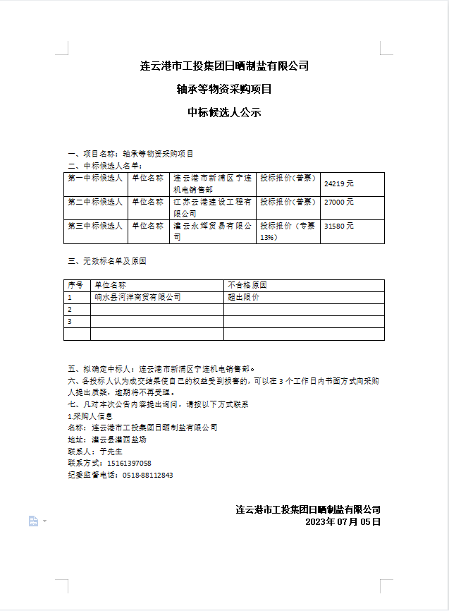 连云港市工投集团日晒制盐有限公司轴承等物资采购项目中标候选人公示