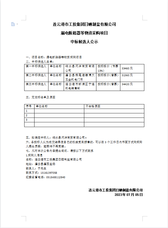 连云港市工投集团日晒制盐有限公司漏电断路器等物资采购项目中标候选人公示